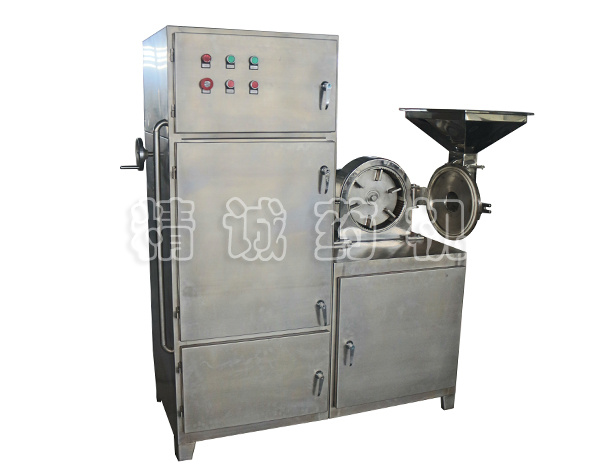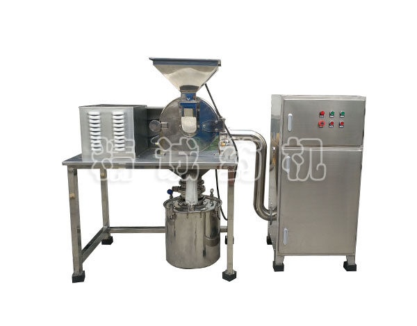 本機采用了風輪式高速旋轉刀,定刀進行沖擊、剪切研磨,粉碎時機腔內產生了強力的氣流,把粉碎室的熱量和成品一起從篩網流出,粒度大小通過更換篩網獲得。